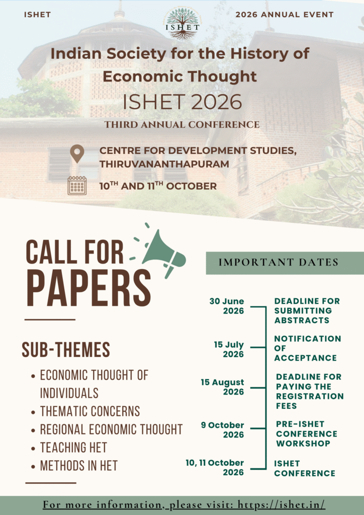 ISHET 2026 will be held at the Centre for Development Studies (CDS), Thiruvananthapuram on 10th and 11th of October 2026.